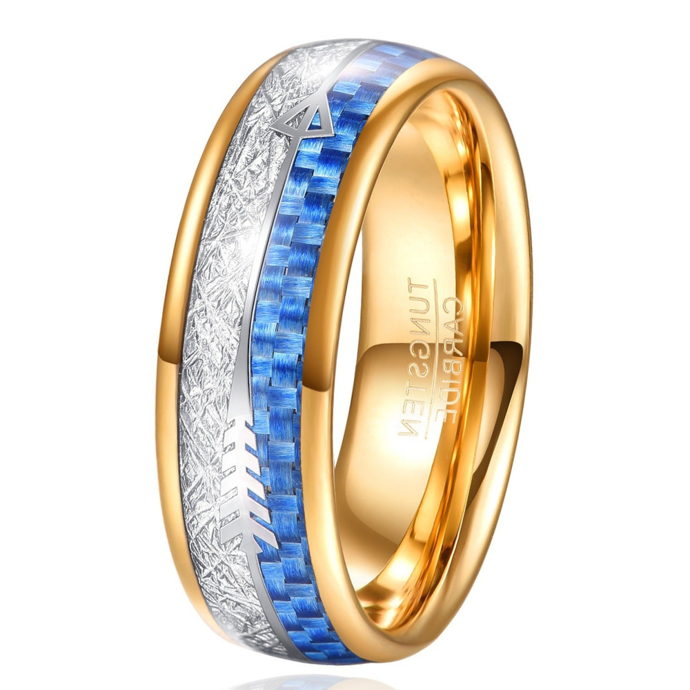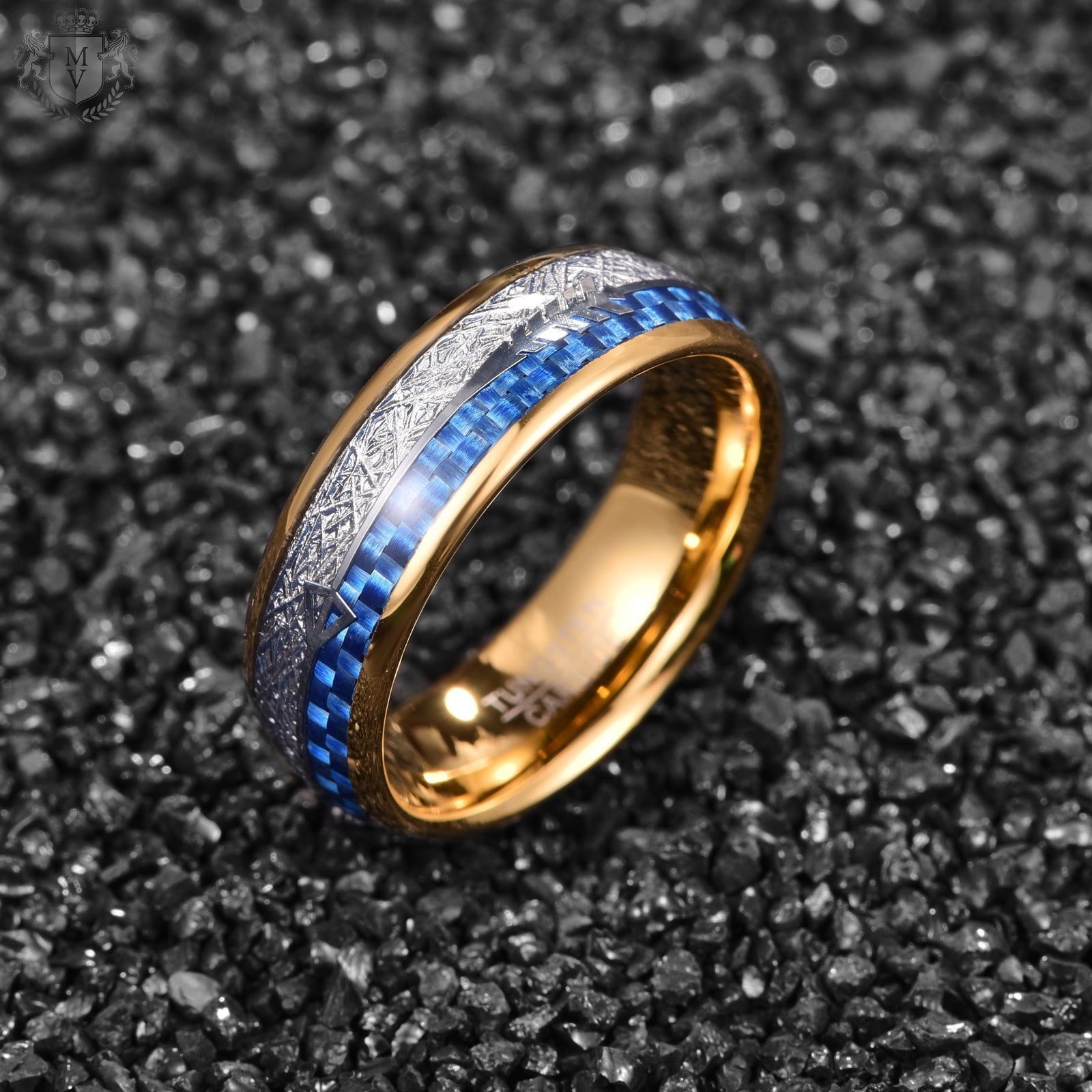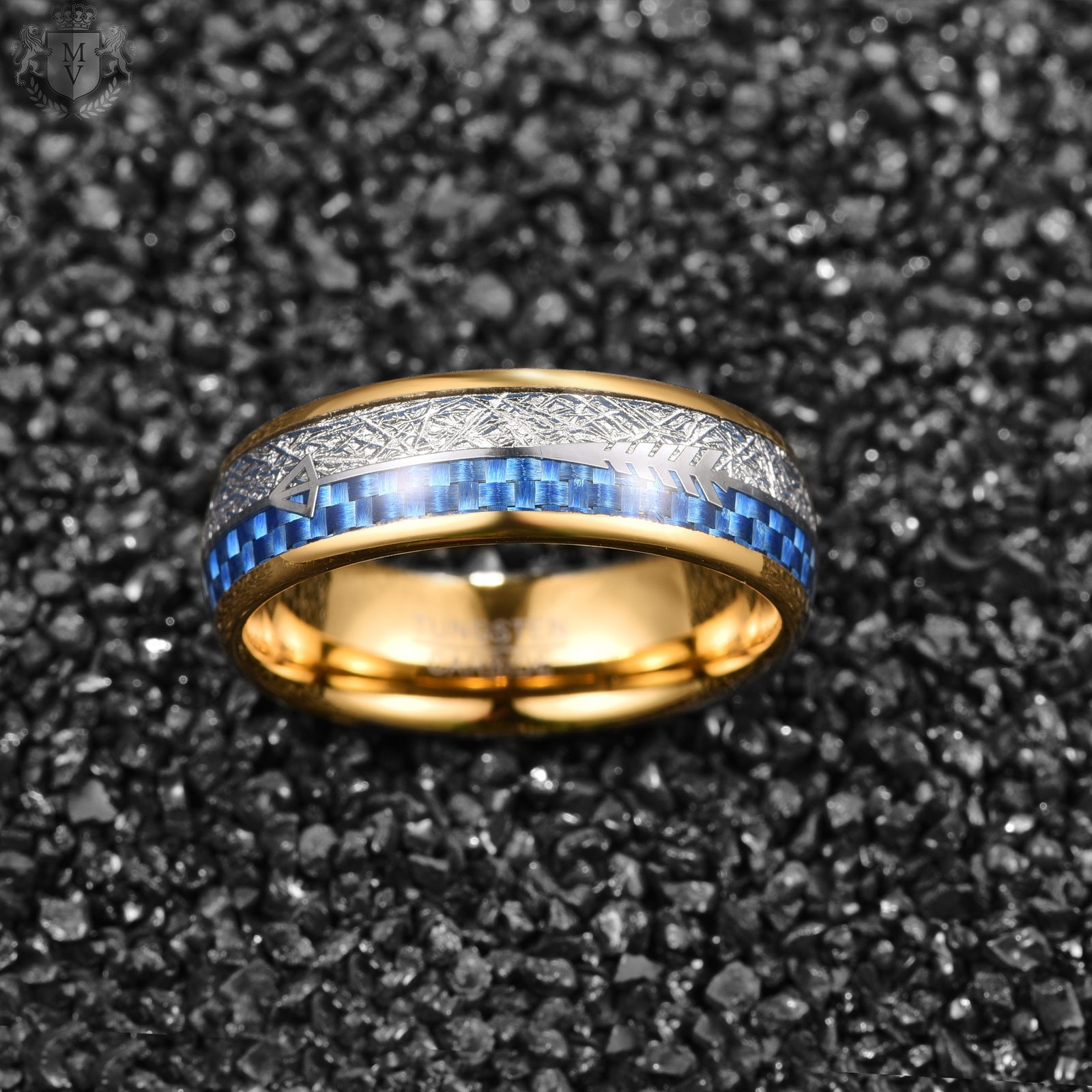 Aetherion is made for those who forge their own path. Crafted from durable tungsten carbide, this ring features a bold gold-colored finish, a vivid blue carbon fiber inlay, and a silver meteorite-textured strip etched with arrow detailing — a symbol of direction, drive, and clarity of purpose. The combination of cosmic inspiration and precision design makes Aetherion a powerful statement for those who lead with vision.