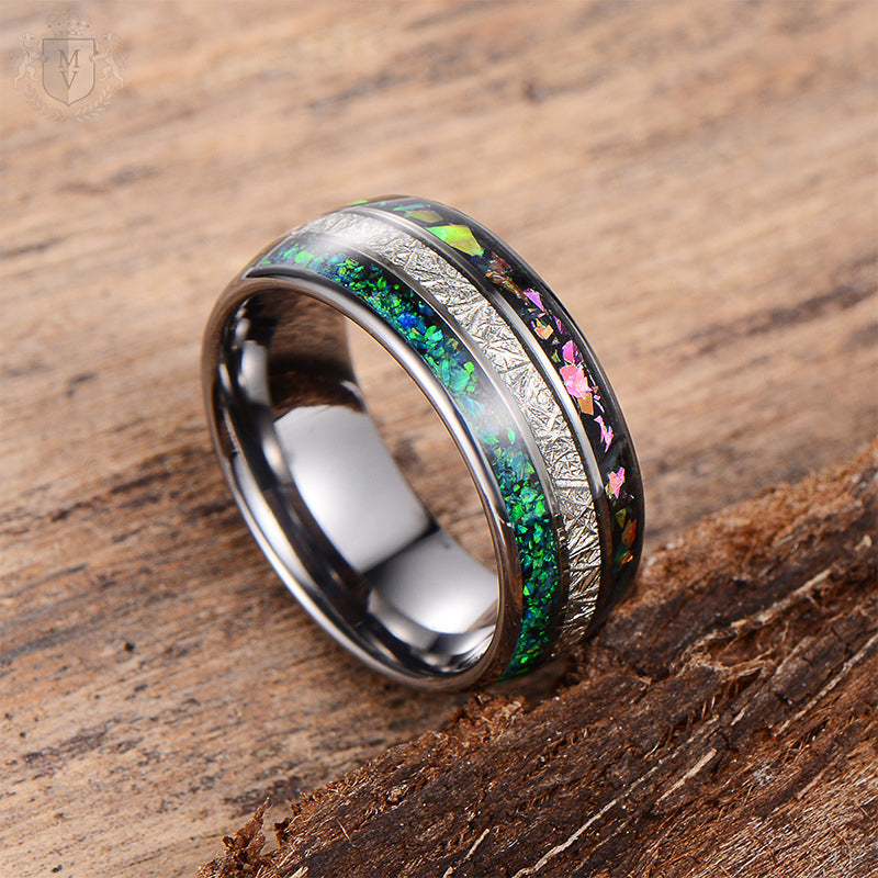 You don’t follow trends — you set them. Astridion is made for those who see beauty in the bold and aren’t afraid to wear something unforgettable. Its polished tungsten body holds three stunning inlays: vibrant green opal, cosmic fire opal, and a meteorite-textured band that feels like it came from another world. Every angle catches the light. Every detail tells a story. If you're looking for a ring that turns heads, sparks conversations, and actually feels like you — this is it.