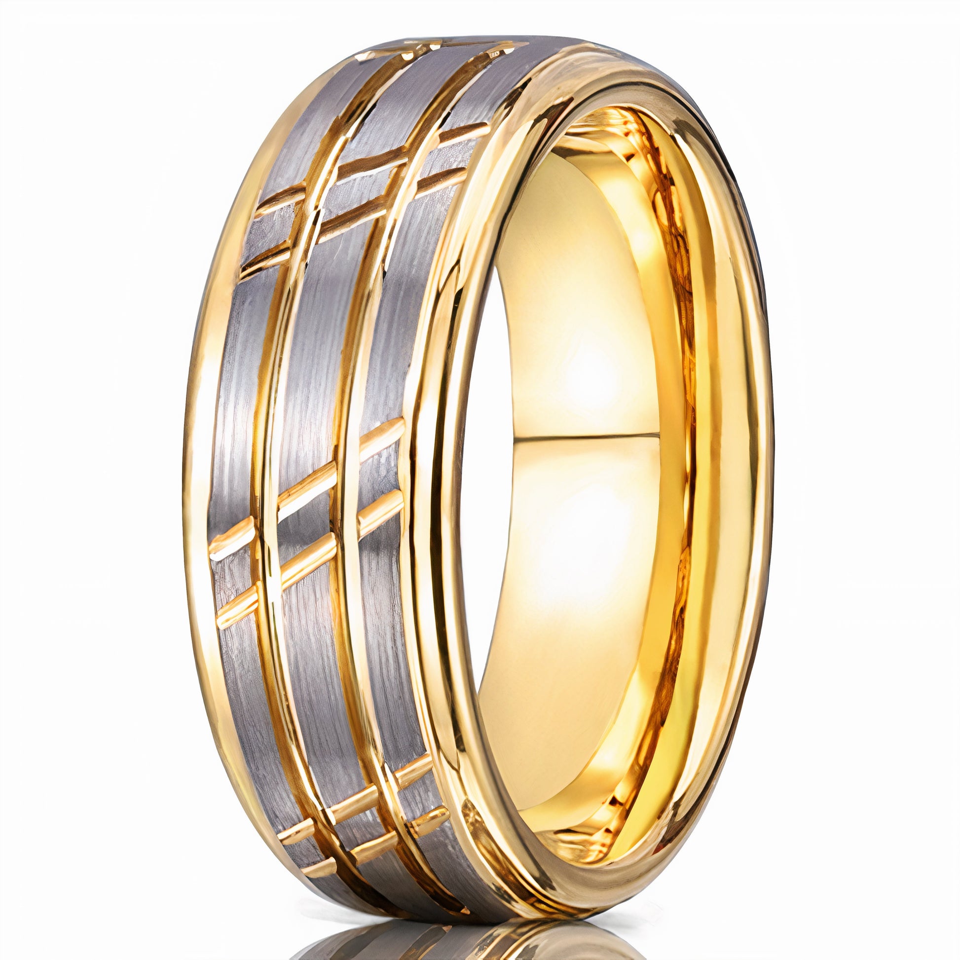 Bravado is a ring that commands attention with its bold contrast and refined craftsmanship. The fusion of brushed silver tungsten carbide with intricate gold-accented grooves creates a striking balance between strength and sophistication. The 18K gold-plated interior adds a touch of luxury, making this ring the perfect symbol of confidence and resilience. Whether worn as a statement piece or a wedding band, Bravado represents unwavering style and character.