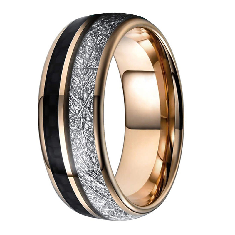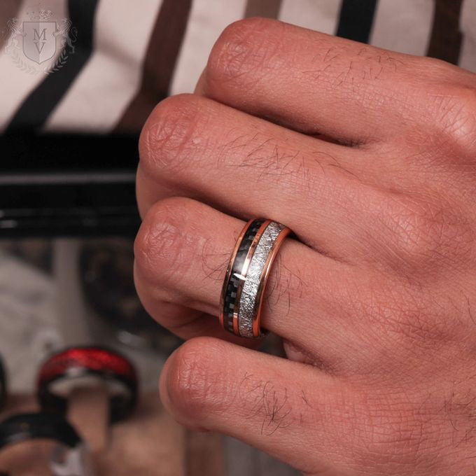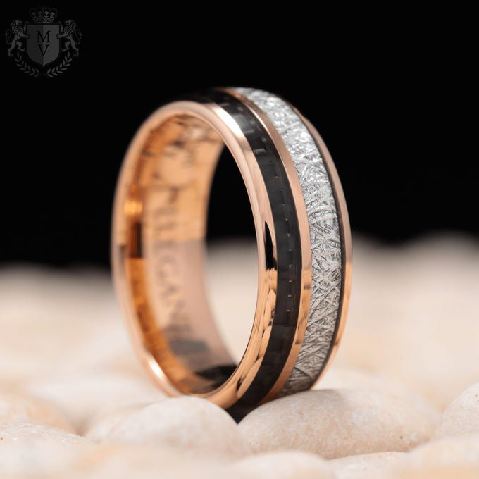 Ferox is made for those who don’t compromise. With a bold meteorite-textured inlay, sleek carbon fiber detailing, and a refined rose gold finish, this ring strikes the perfect balance between raw intensity and modern elegance. Every element is designed to stand out — not with flash, but with presence. Strong, structured, and unapologetically confident, Ferox isn’t just worn — it’s owned.