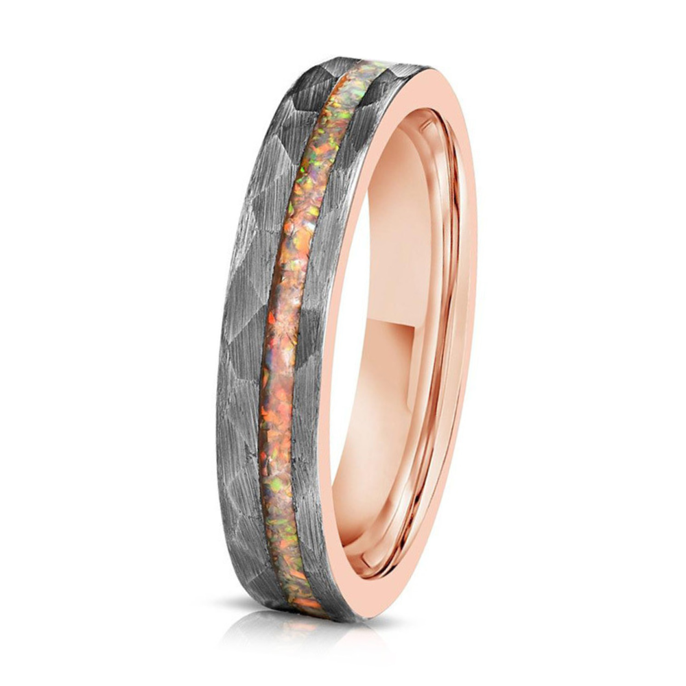 Forge is a statement of raw strength and refined craftsmanship. The hammered tungsten carbide exterior exudes durability and character, while the electric rose gold finish adds a modern, sophisticated touch. Accented with a striking opal inlay, this ring captures the perfect balance between resilience and elegance. Designed to stand the test of time, Forge is a bold expression of individuality and enduring style.