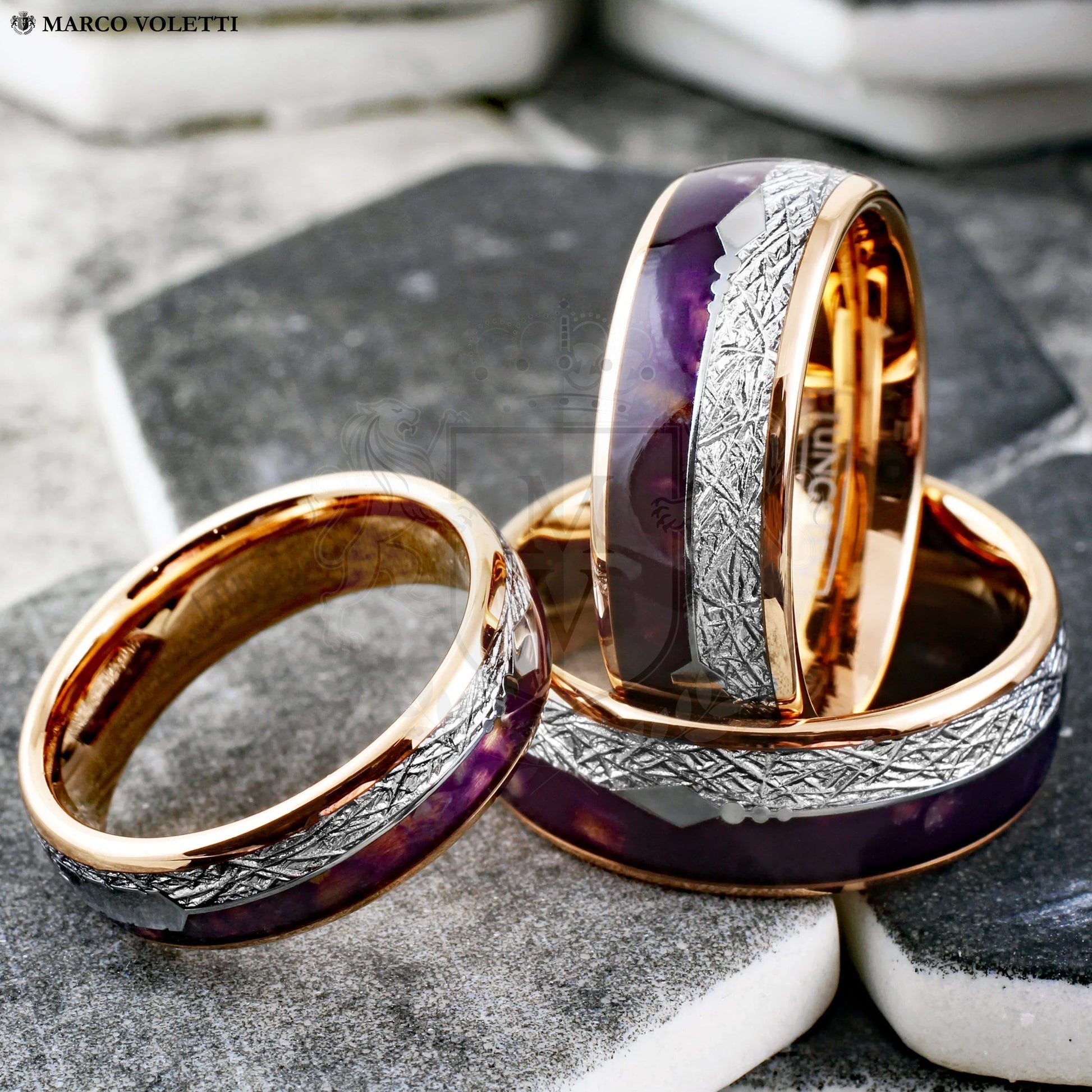 Guardian is crafted for those who protect what they hold dear, embodying the unyielding strength and vigilance of a protector. The rose gold tungsten frame offers both durability and sophistication, while the inlays of speckled purple lapis lazuli, meteorite, and silver feathered arrows symbolize watchfulness, cosmic strength, and readiness to defend. This ring represents not only the power of protection but also the deep, unbreakable bond between two people. Designed for those committed to safeguarding their connection, Guardian stands as a symbol of eternal loyalty and the unbreakable trust shared in a partnership.