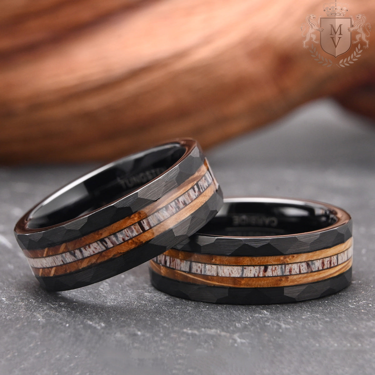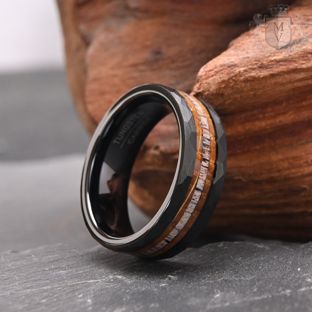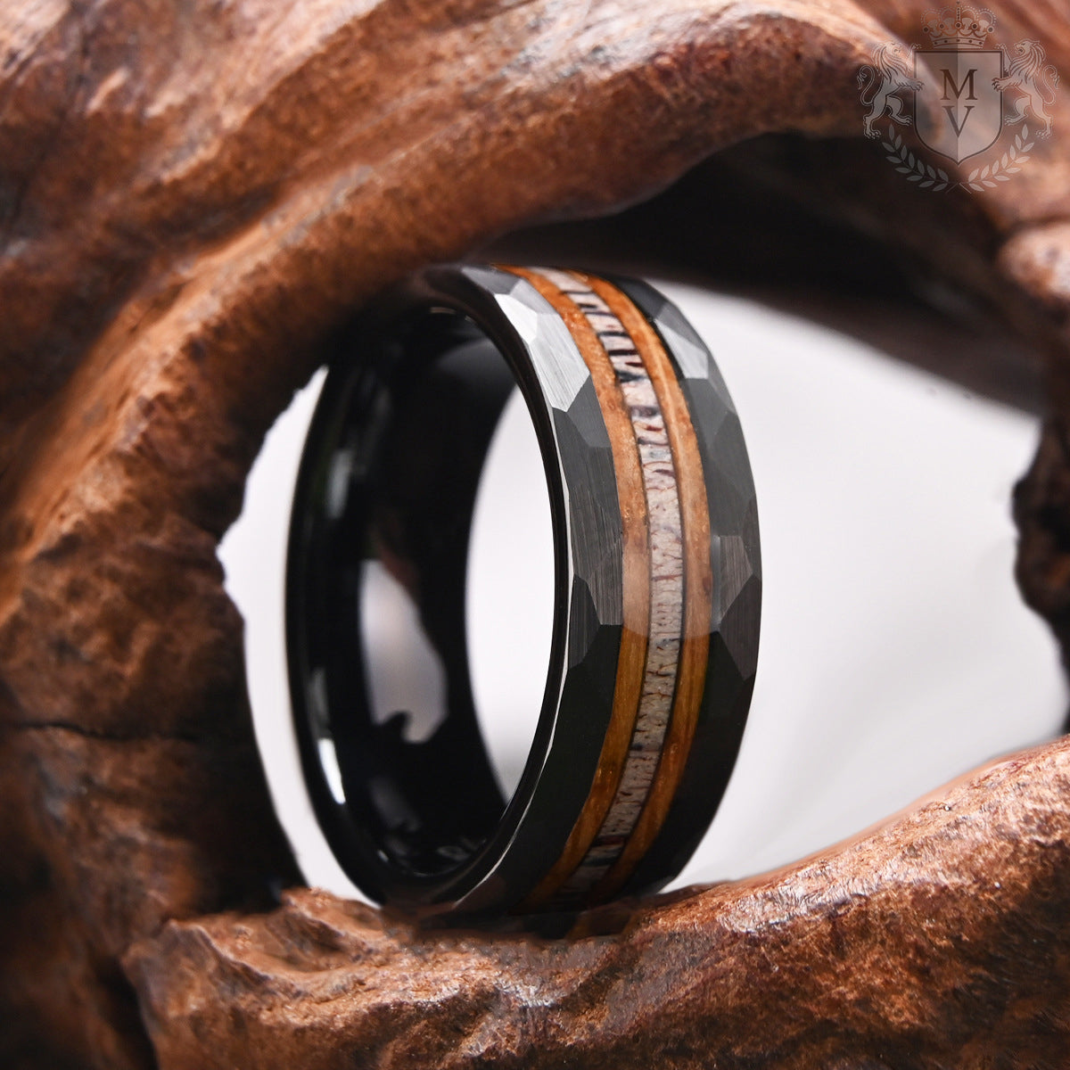 Huntress is a tribute to nature’s raw beauty and resilience. Crafted from sleek black tungsten carbide, this ring is inlaid with genuine antler, symbolizing strength, tradition, and a deep connection to the wild. Designed for those who embrace adventure and the call of the wilderness, its bold contrast and organic textures make it a statement of rugged elegance.
