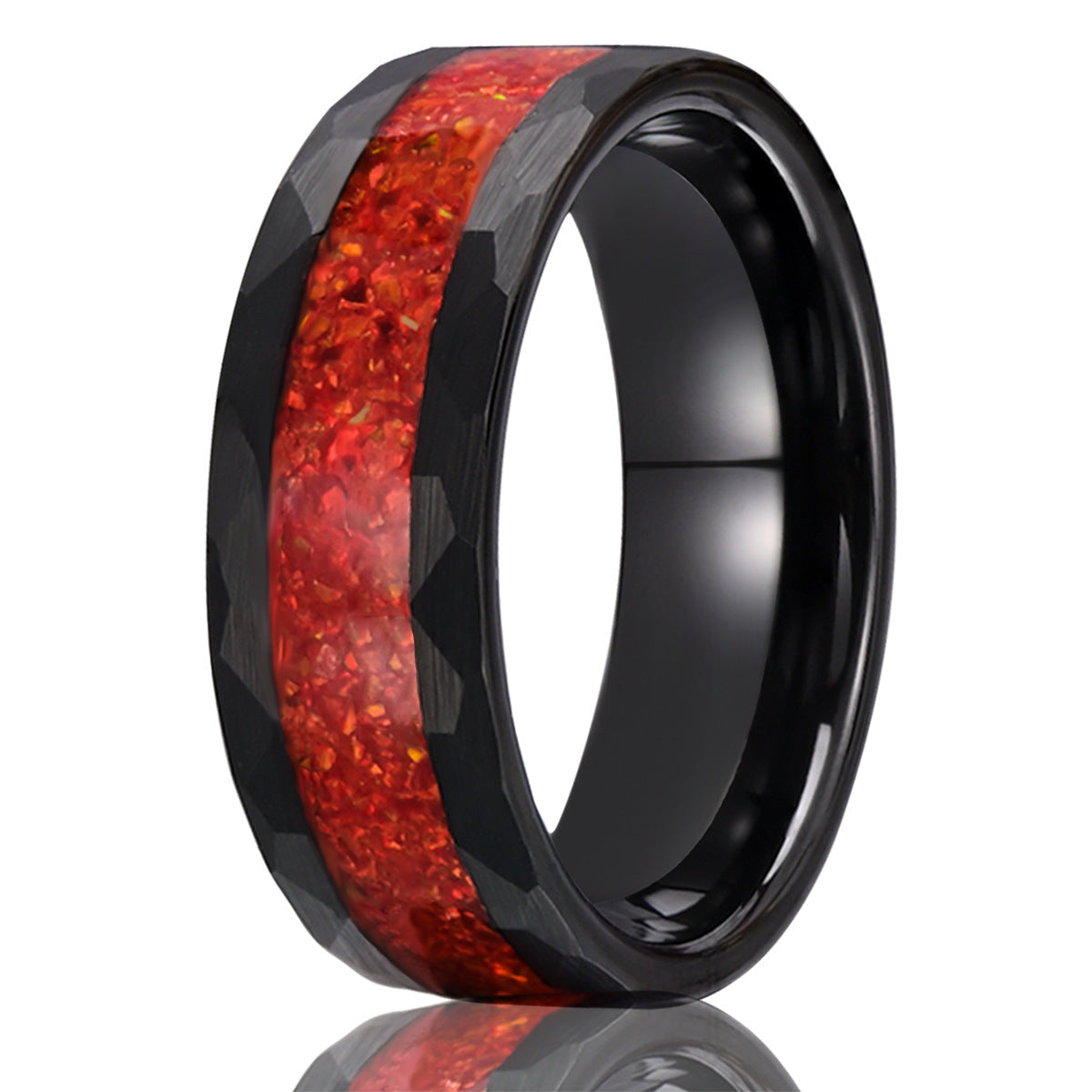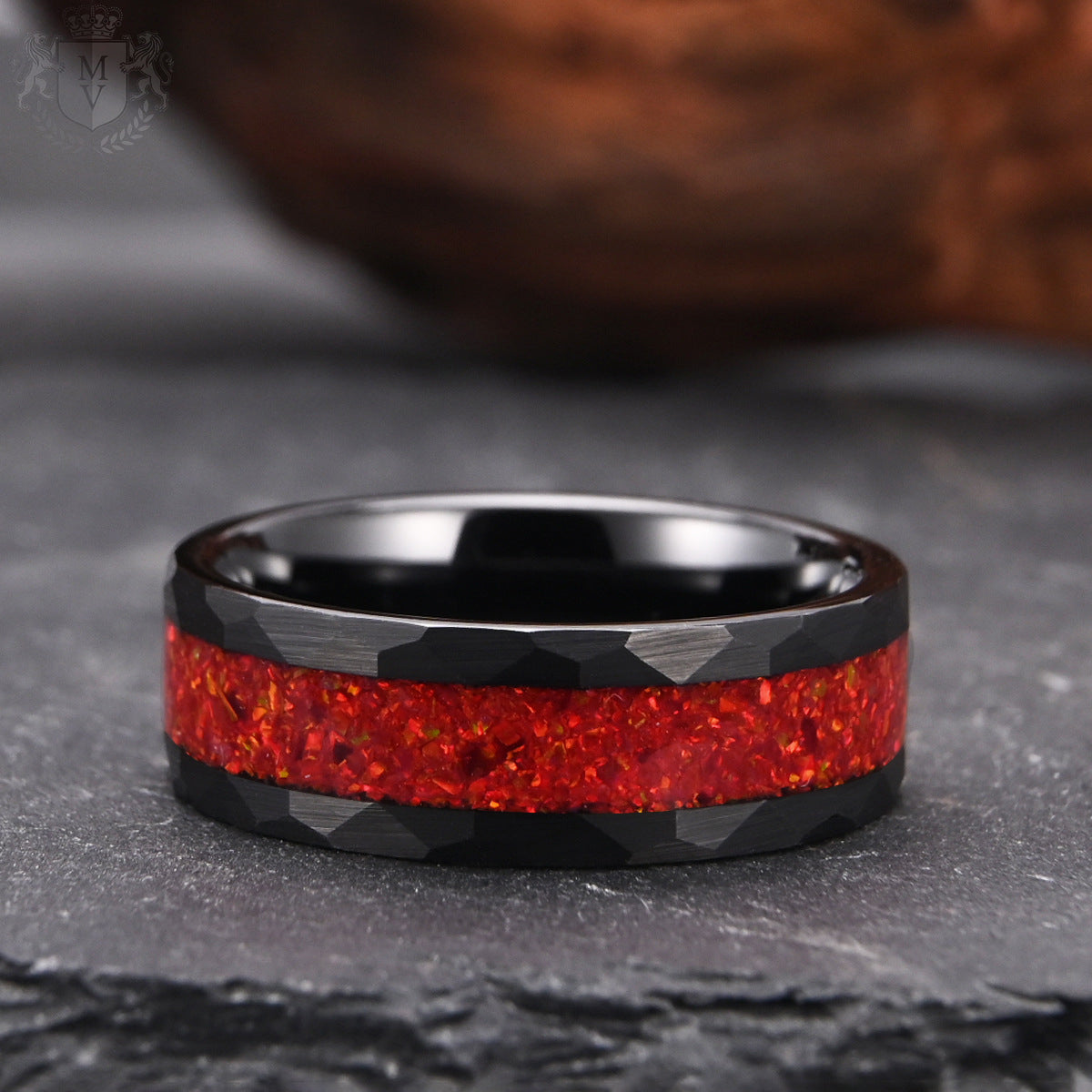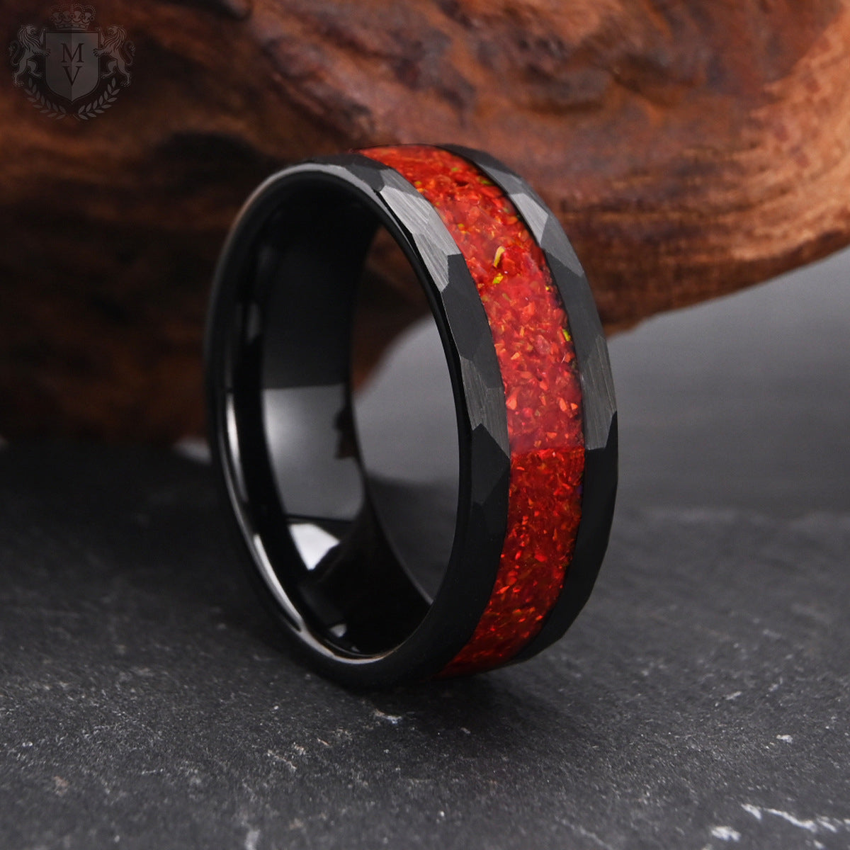 Inferno captures the intensity of passion and strength with its striking design. Crafted from high-quality black tungsten carbide, this ring features a vibrant red opal inlay, reminiscent of fiery embers. The intricate facets on the black tungsten give the ring an added dimension, enhancing its bold character. Whether for everyday wear or as a statement piece, Inferno represents strength, passion, and the drive to stand out.