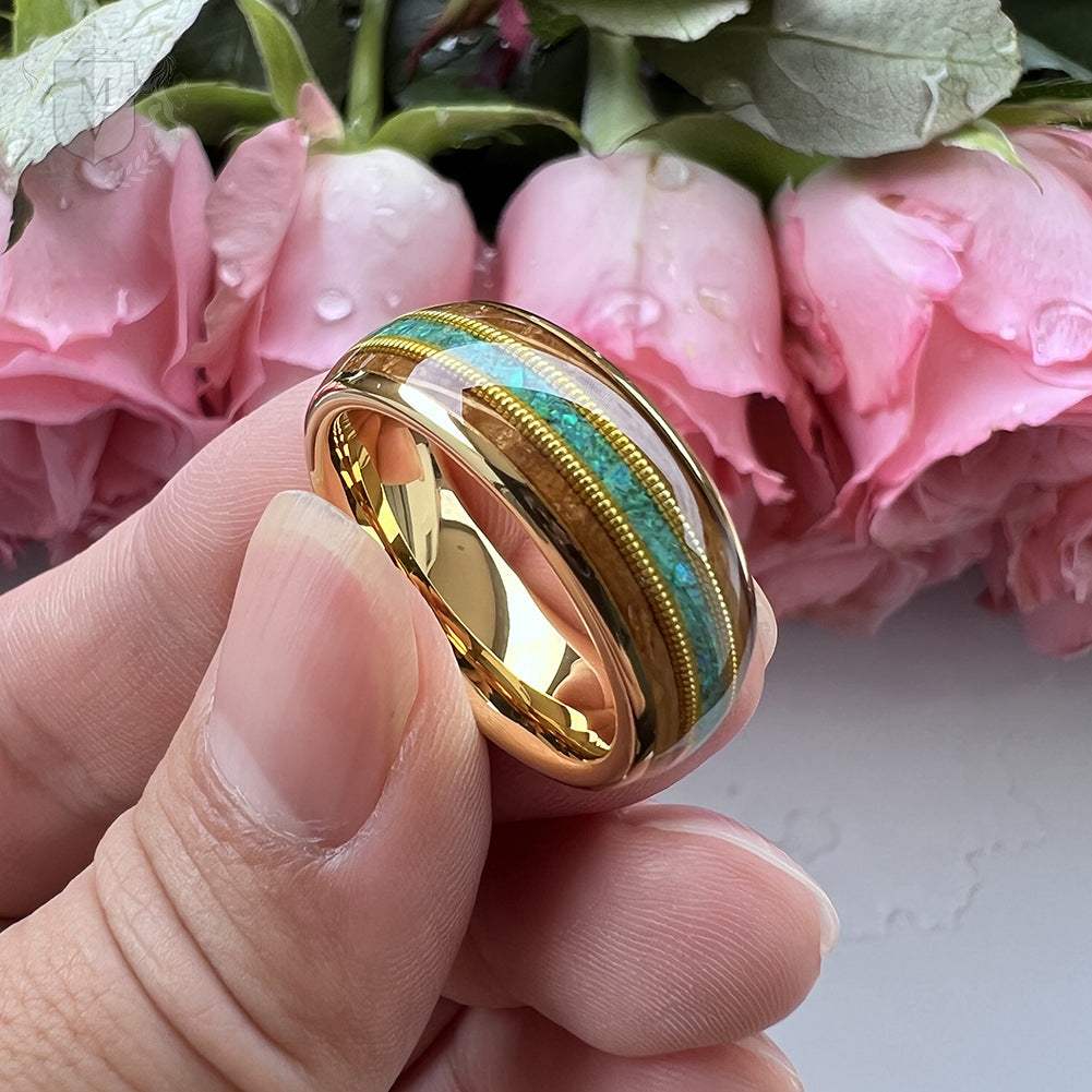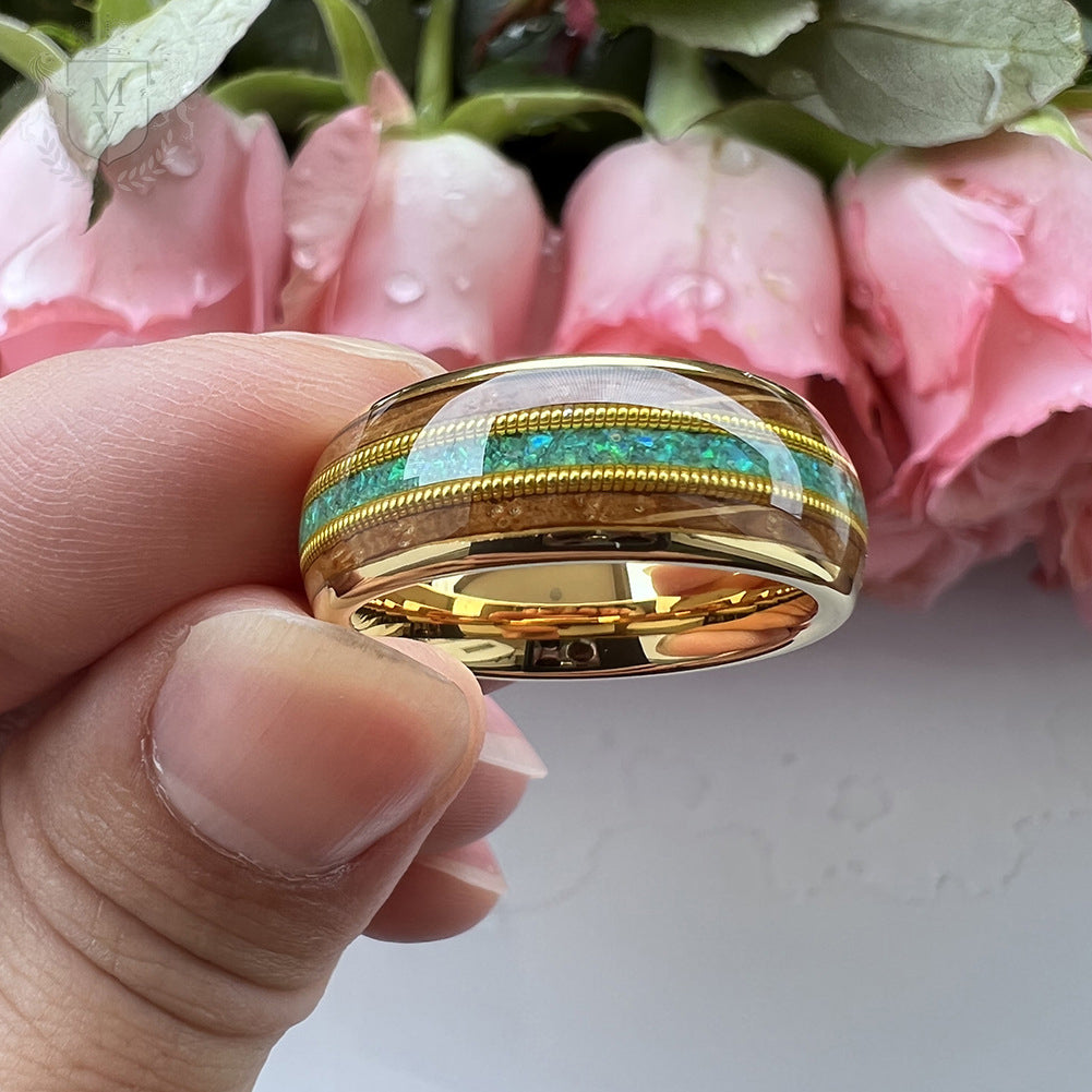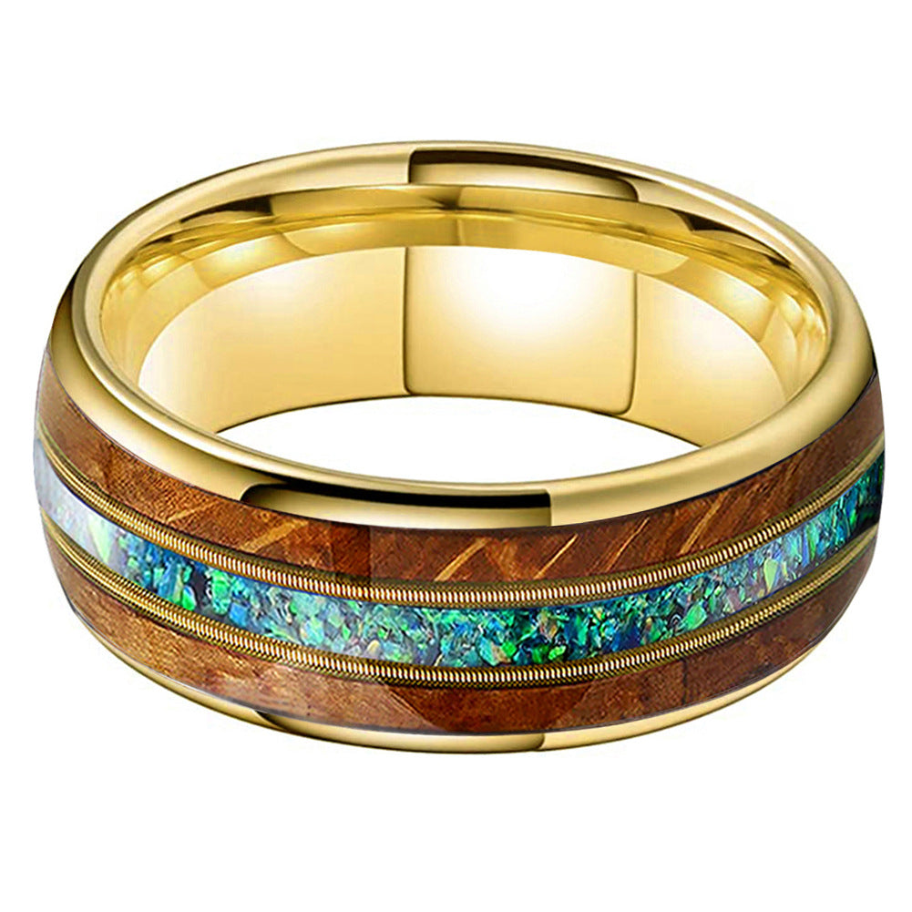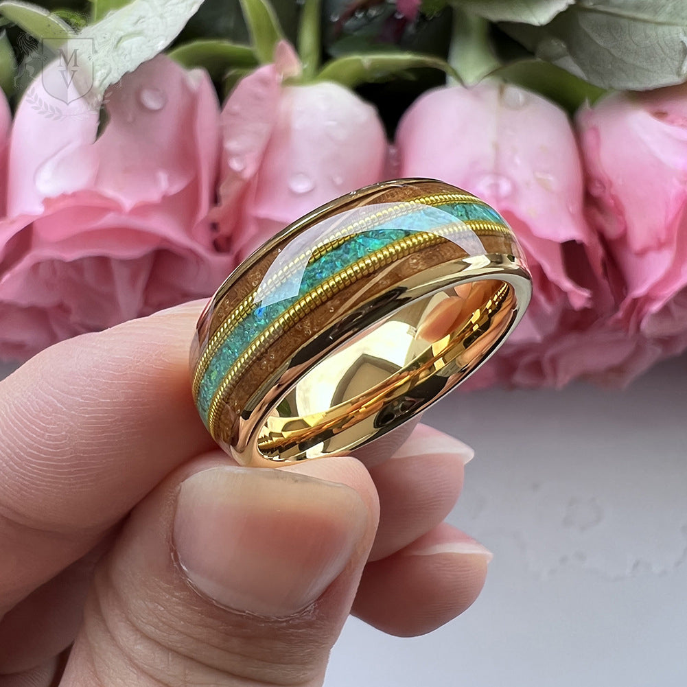 Kaelen is a tribute to the harmony of craftsmanship and the wild. The inlay of rich whiskey barrel wood and shimmering green opal reflects earth and ocean, bordered by twin golden guitar string accents for a rhythm that feels alive. Encased in a polished gold-plated tungsten body, this ring is for those who walk their own path — grounded, bold, and completely untamed.