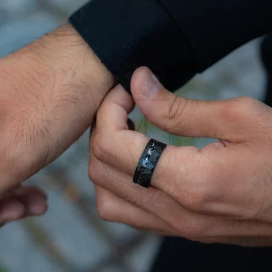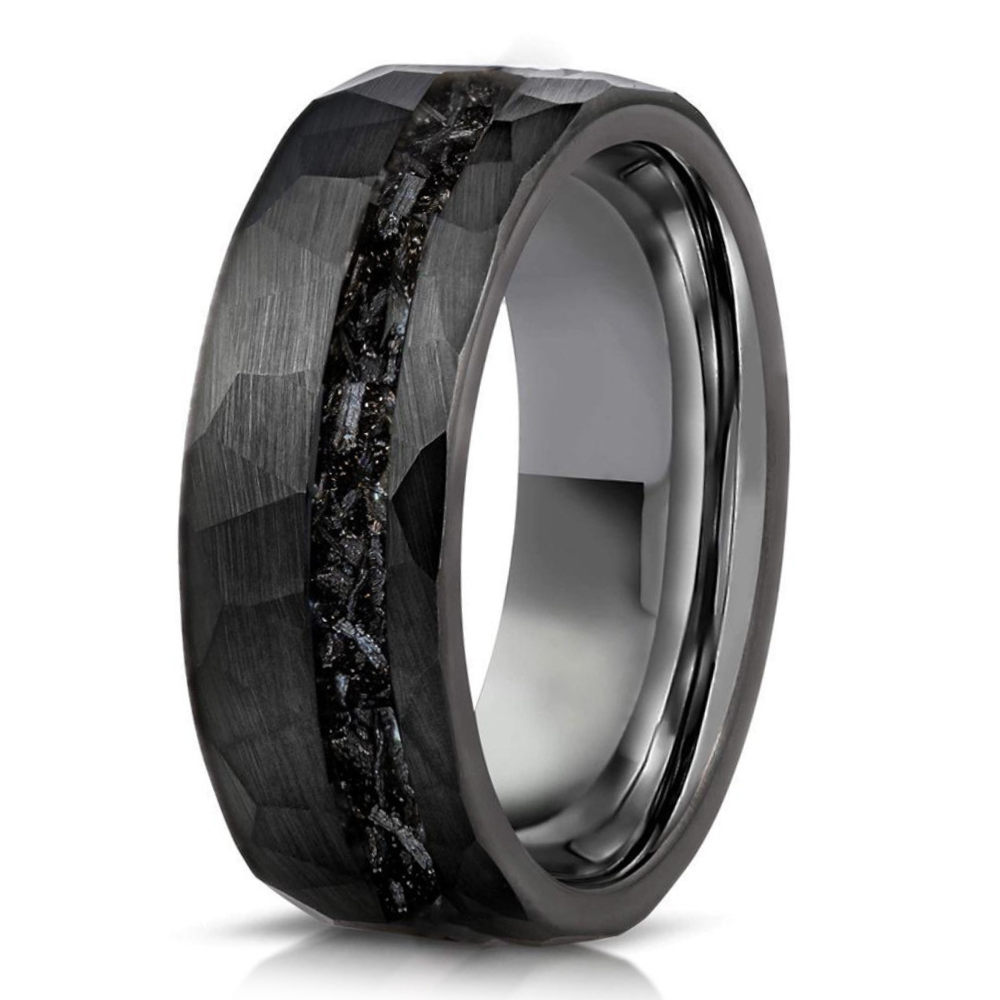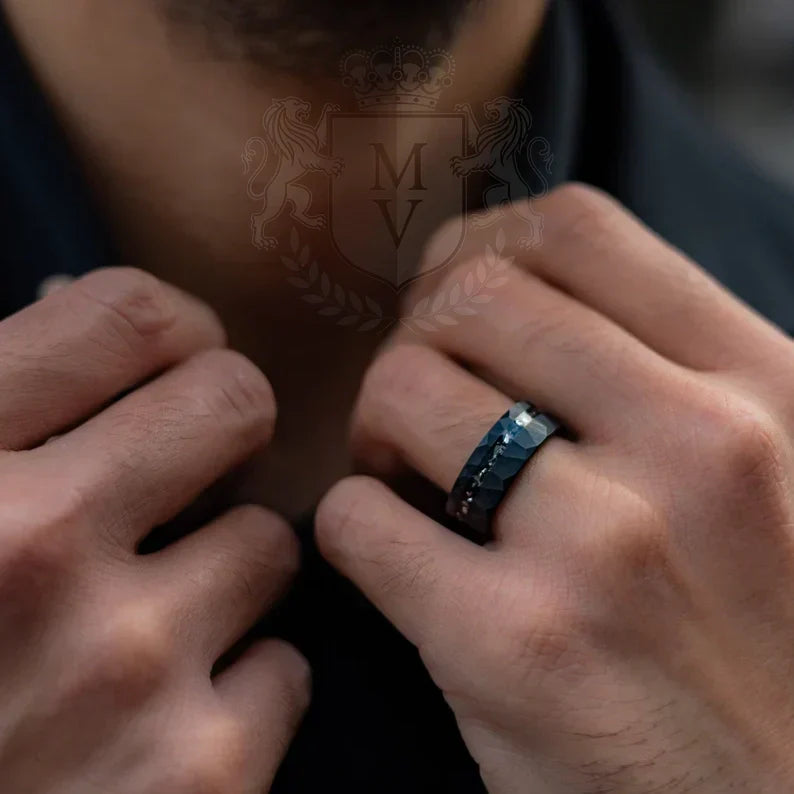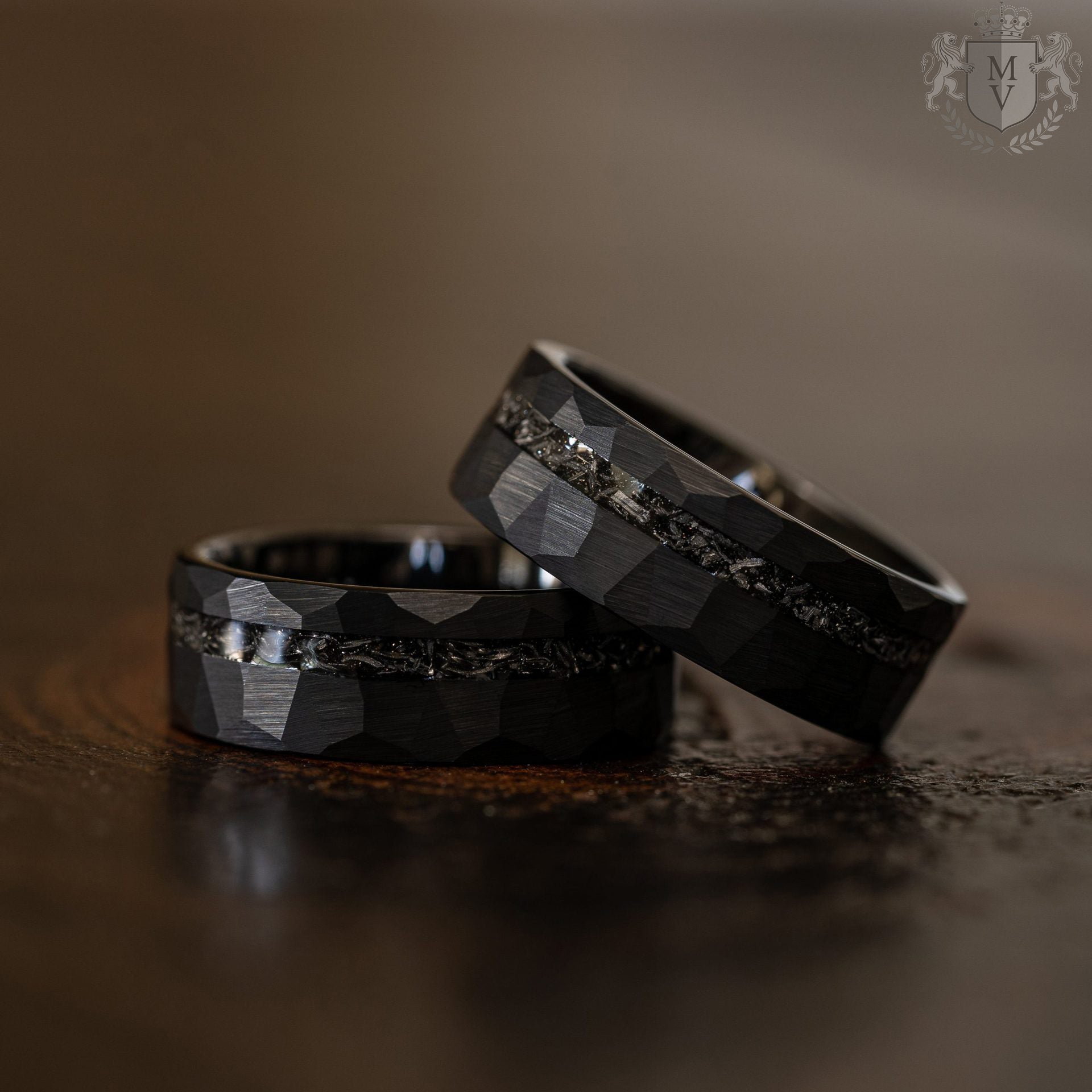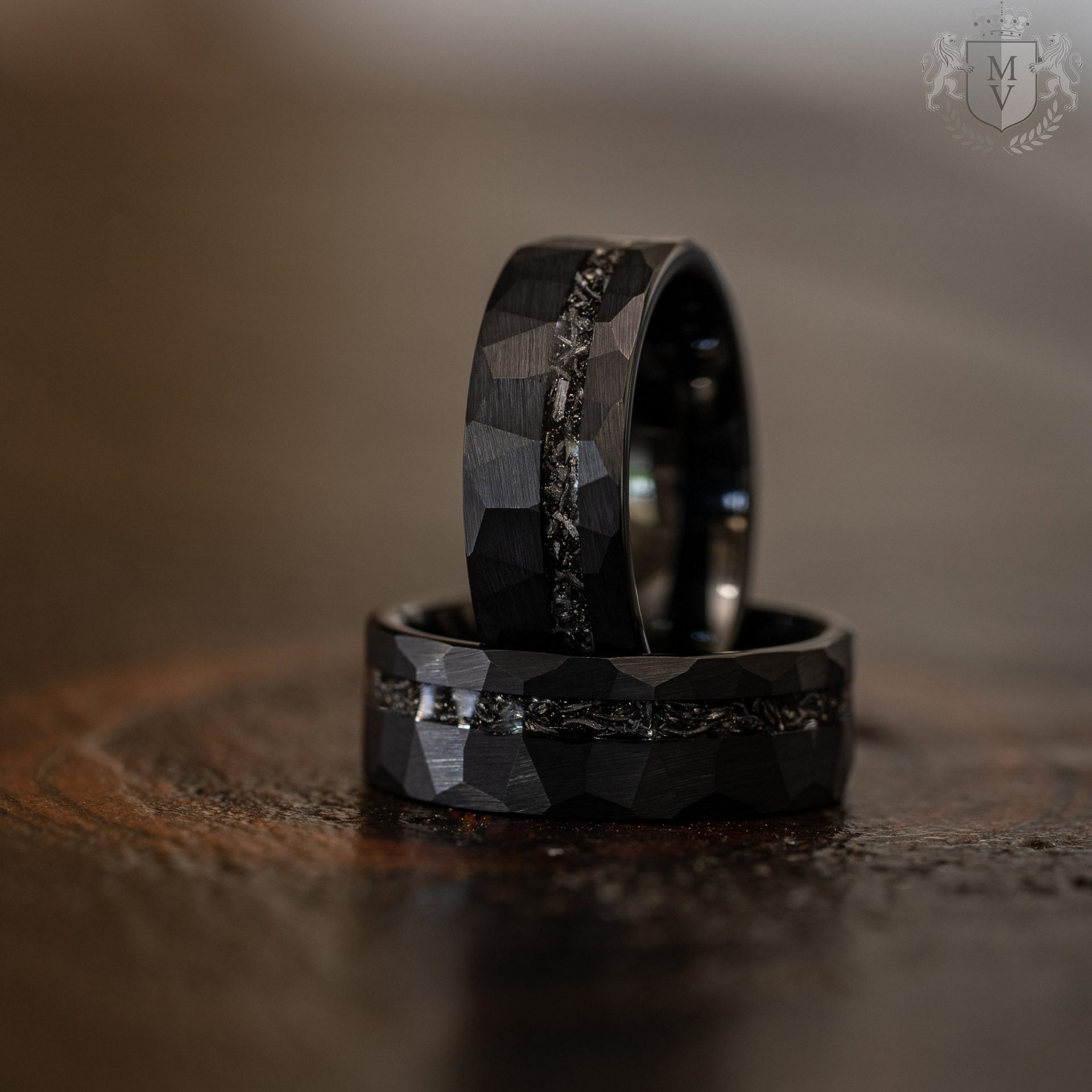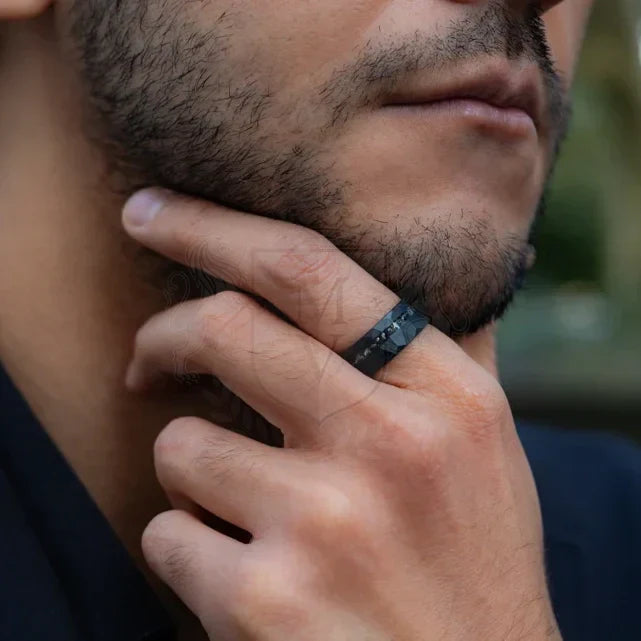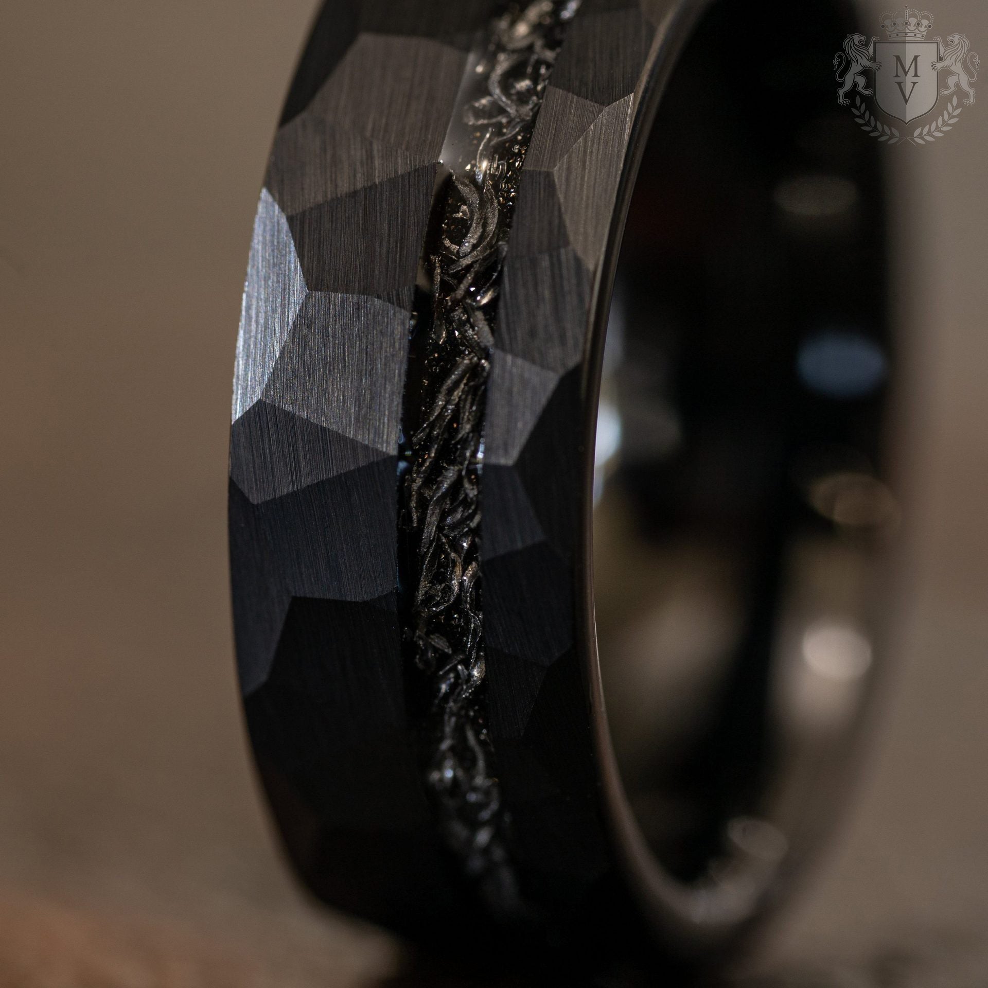 Oblivion is a statement of mystery and strength. Crafted from hammered black tungsten carbide, this ring features a bold inlay of meteorite, capturing the raw essence of celestial fragments. Its faceted surface and deep black tones embody resilience, exploration, and a connection to the infinite.