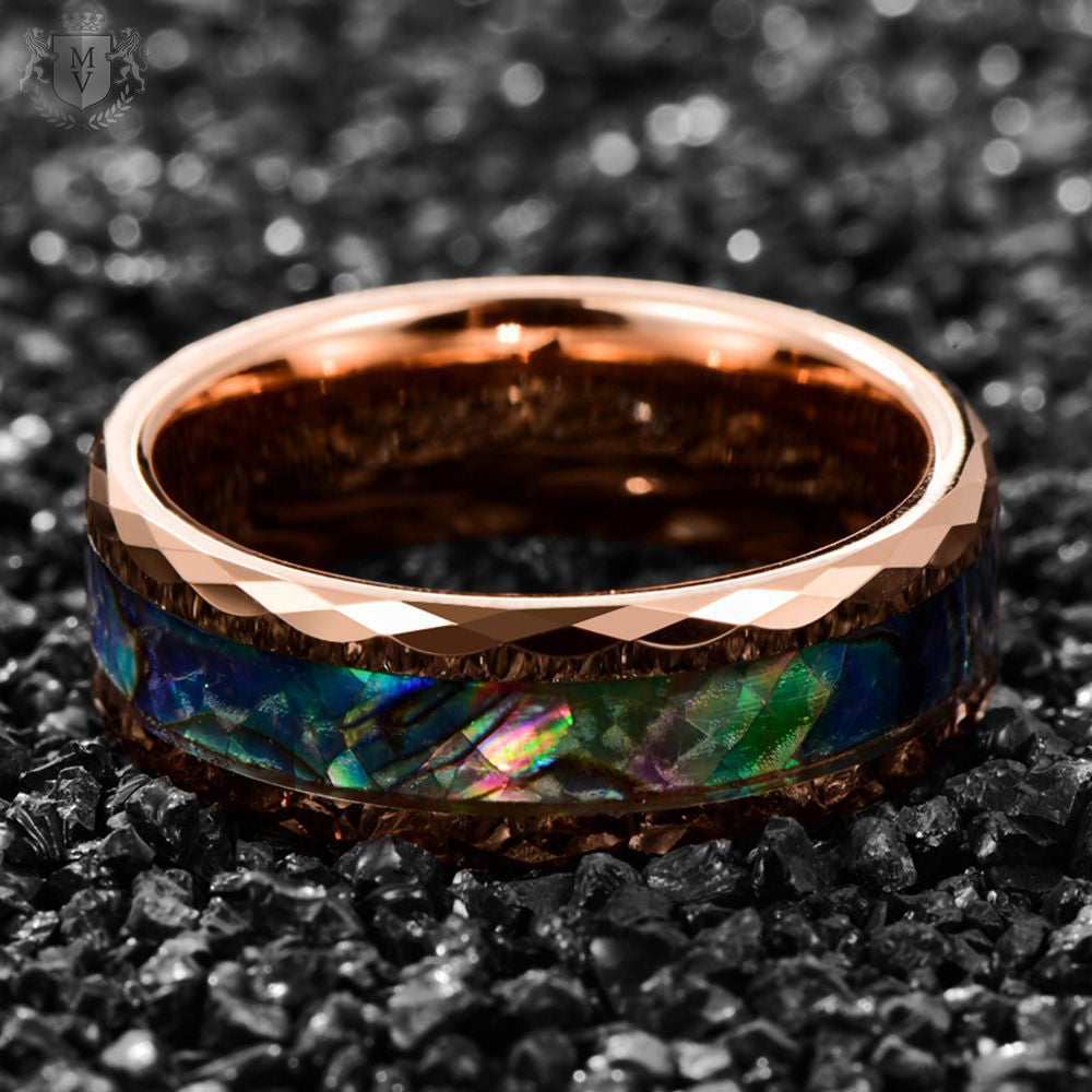 Orionis is where cosmic beauty meets refined craftsmanship. Set in a faceted rose gold-colored tungsten band, the center features abalone shell — glowing with iridescent blues, greens, and purples like the shifting sky. The precision-cut edges catch the light with every movement, adding a touch of luxury to a ring grounded in nature’s most dazzling textures. A rare balance of strength and brilliance, Orionis is made for those who carry light with them.