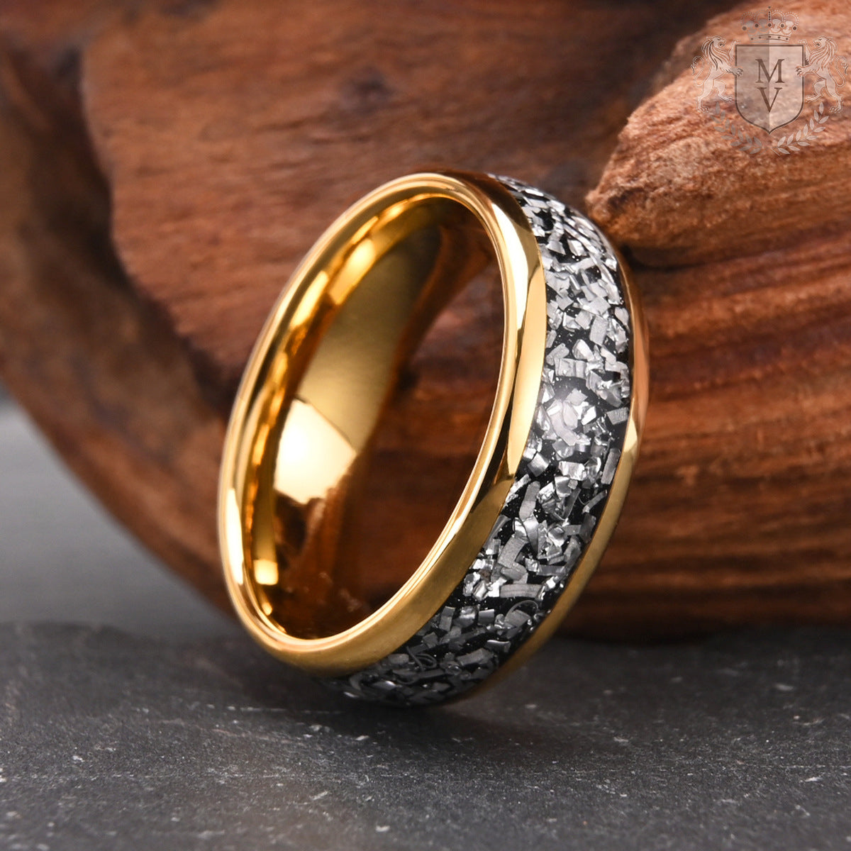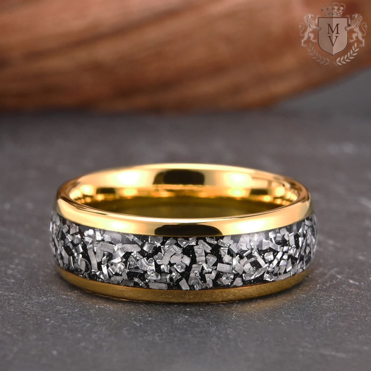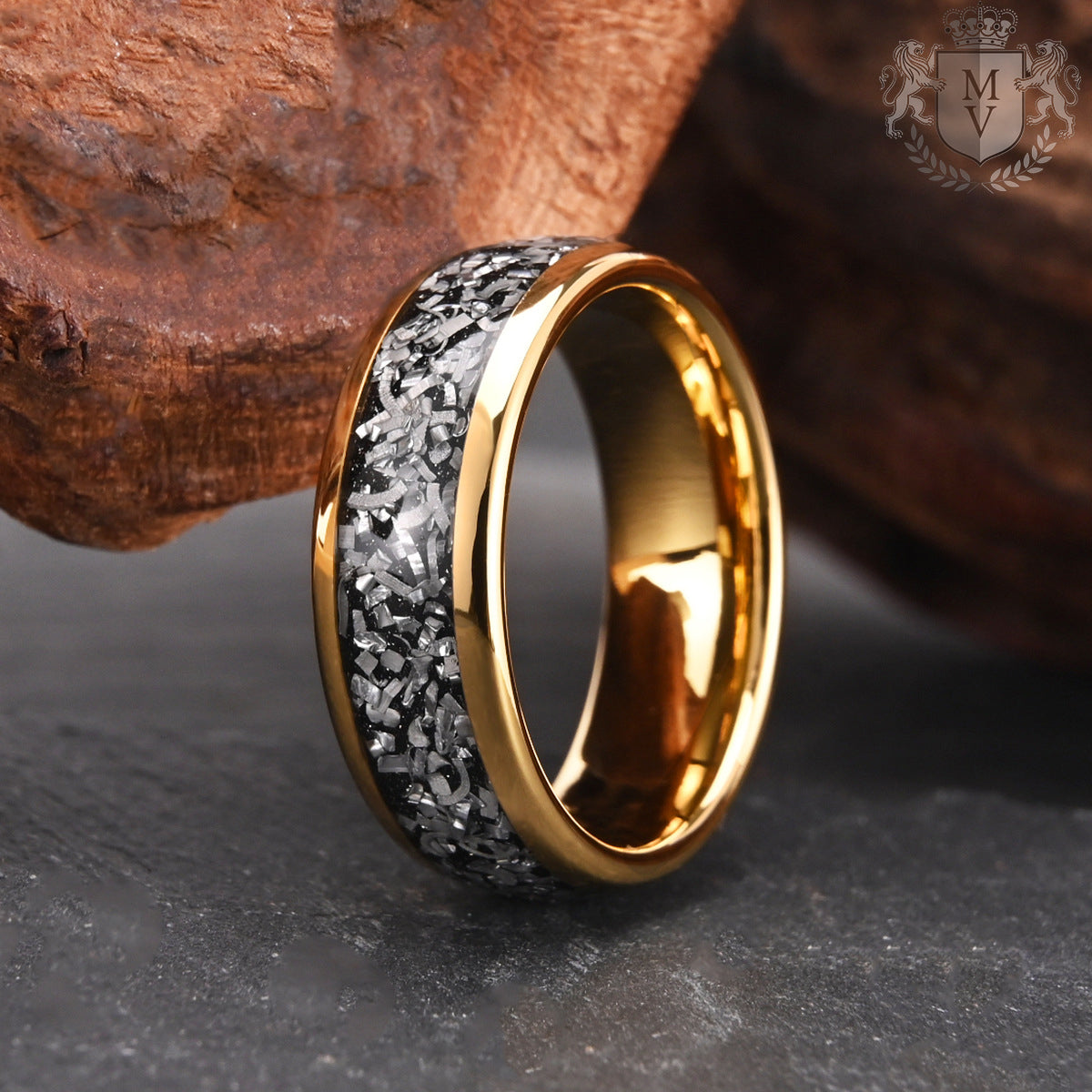 Solaris is a masterpiece of cosmic energy and refined craftsmanship. The radiant 18K gold-plated tungsten carbide band is inlaid with genuine meteorite fragments, capturing the raw power of the universe within an elegant design. A perfect balance of strength and sophistication, this ring is for those who command presence and embrace the extraordinary.