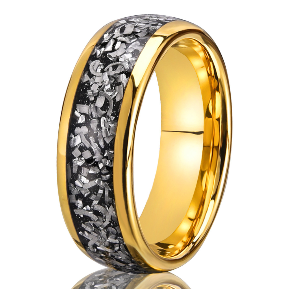 Materials: 18K gold-plated tungsten carbide, meteorite inlay.