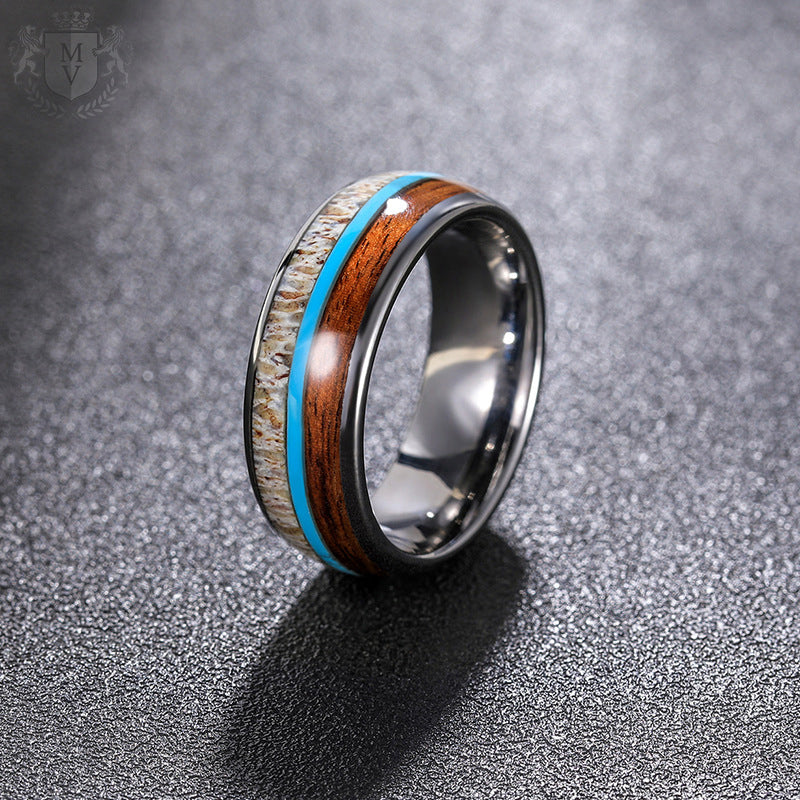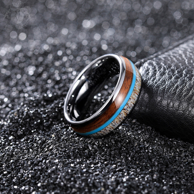 Talon is a tribute to the wild — where strength is earned and style is raw. This 8mm tungsten ring combines natural elements in perfect harmony: deep reddish wood, rugged deer antler, and a vivid turquoise stripe that cuts through with clarity and contrast. Set in a polished silver-toned band, Talon is built to endure and designed to stand apart. For those who live boldly and stay grounded.