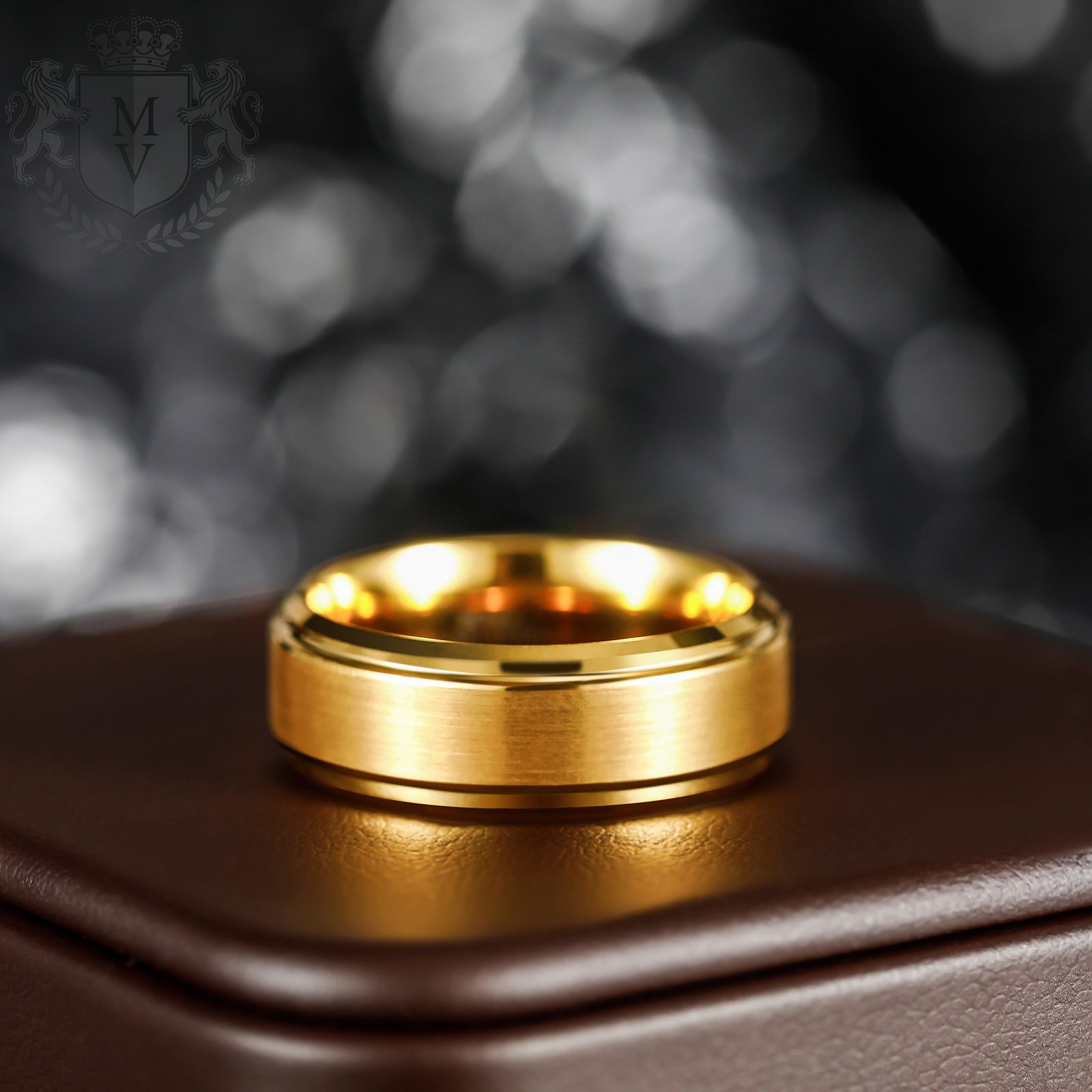 Tharos is where power meets elegance. Crafted from durable tungsten carbide and finished in radiant 24K gold plating, this ring is designed to leave a lasting impression. The brushed surface and stepped edges add refined detail, giving it a timeless yet modern look. Whether worn as a wedding band or statement piece, Tharos stands for strength, presence, and enduring sophistication.