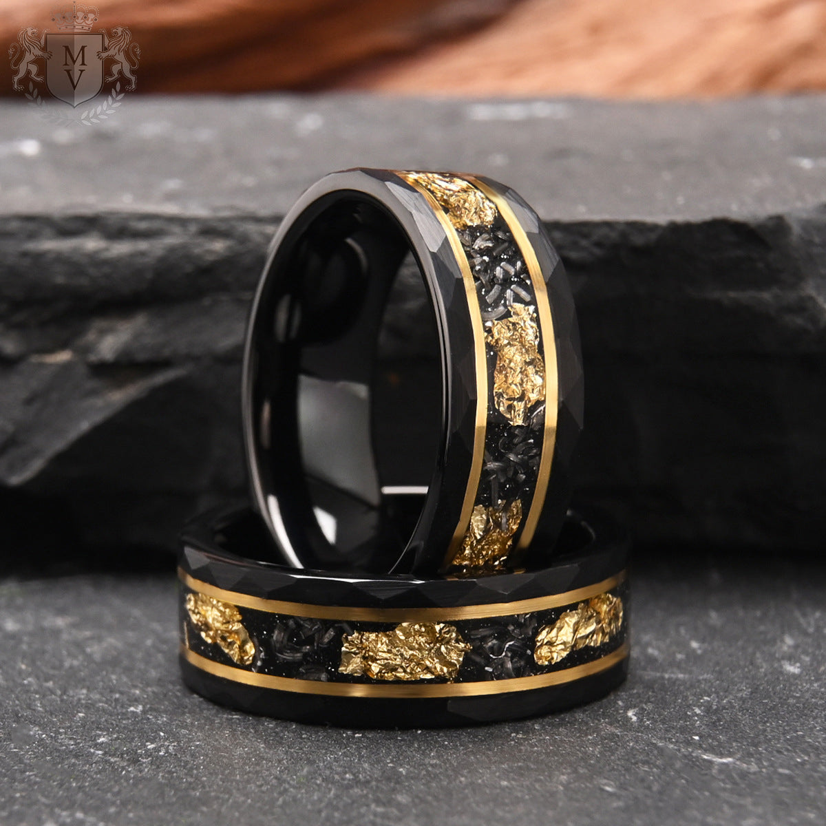 Titanfall embodies the power of the universe, crafted from hammered black tungsten carbide for an unmistakable rugged aesthetic. The inlays of genuine meteorite and 24K gold flakes create a striking contrast, symbolizing cosmic resilience and timeless strength. Designed for those who carry the spirit of the stars, this ring is a bold statement of durability and prestige.