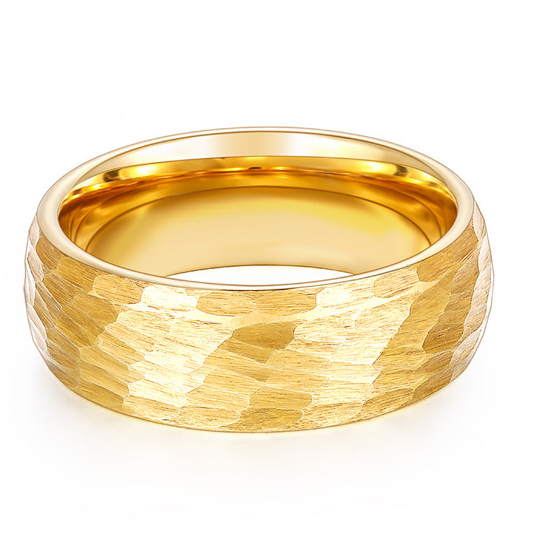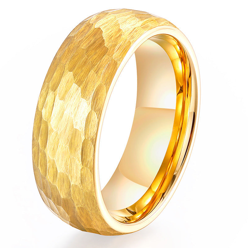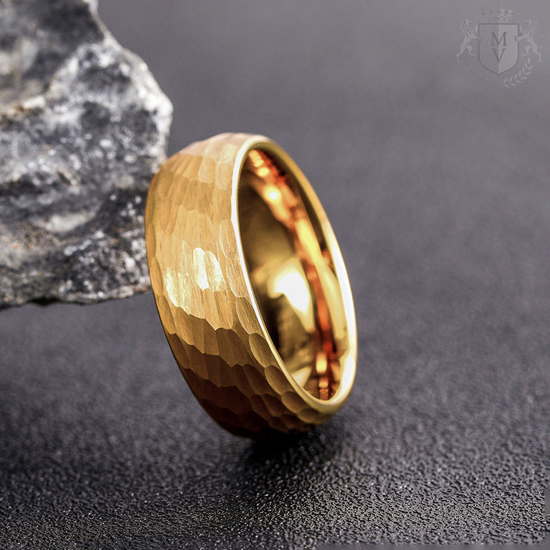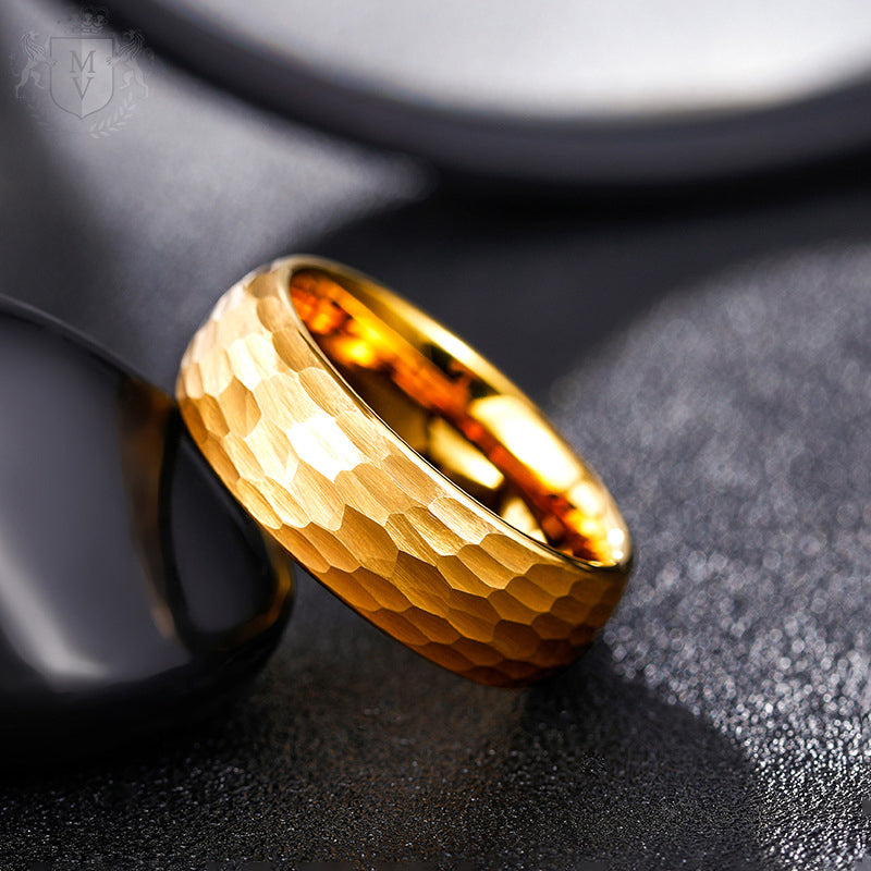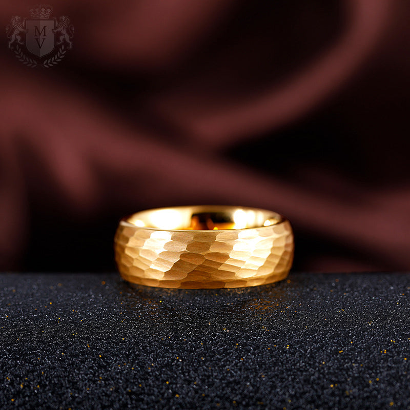 Valiant brings a bold, textured presence to the classic gold ring. Crafted from premium tungsten carbide and finished in radiant 24K gold plating, it features a distinct hammered surface that catches light from every angle. The result is a ring that feels powerful, refined, and built to last. Whether worn as a wedding band or personal statement, Valiant stands as a symbol of strength, resilience, and timeless character.
