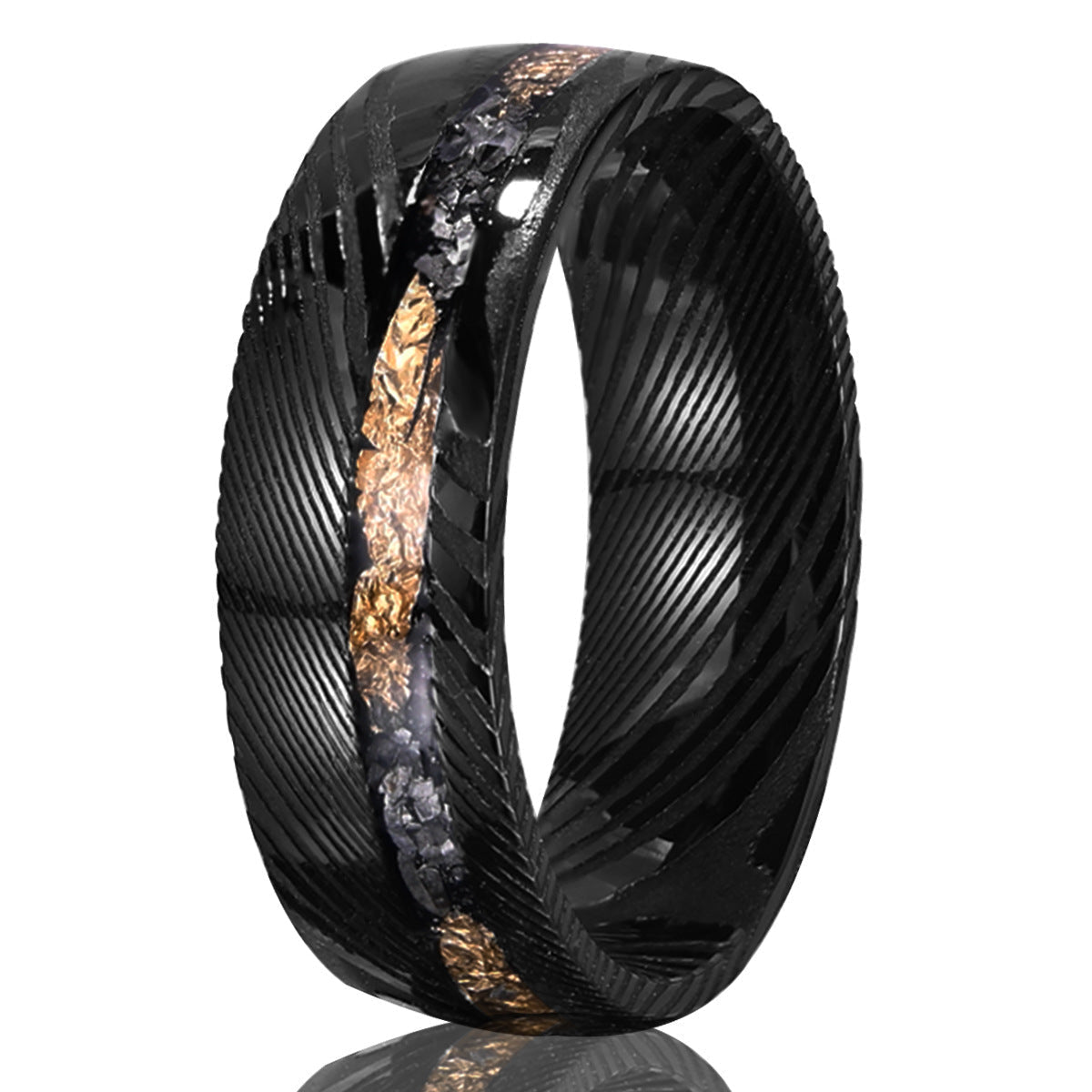 Varekai is made for those who walk their own path. The Damascus steel exterior, plated in deep black, creates a hypnotic flow of ridges and raw texture. A jagged inlay of meteorite-like fragments and shimmering 18K gold foil carves through the center — a reminder that chaos often hides brilliance. It’s a ring that feels untamed but purposeful, crafted for men who don’t just follow stories — they write them.