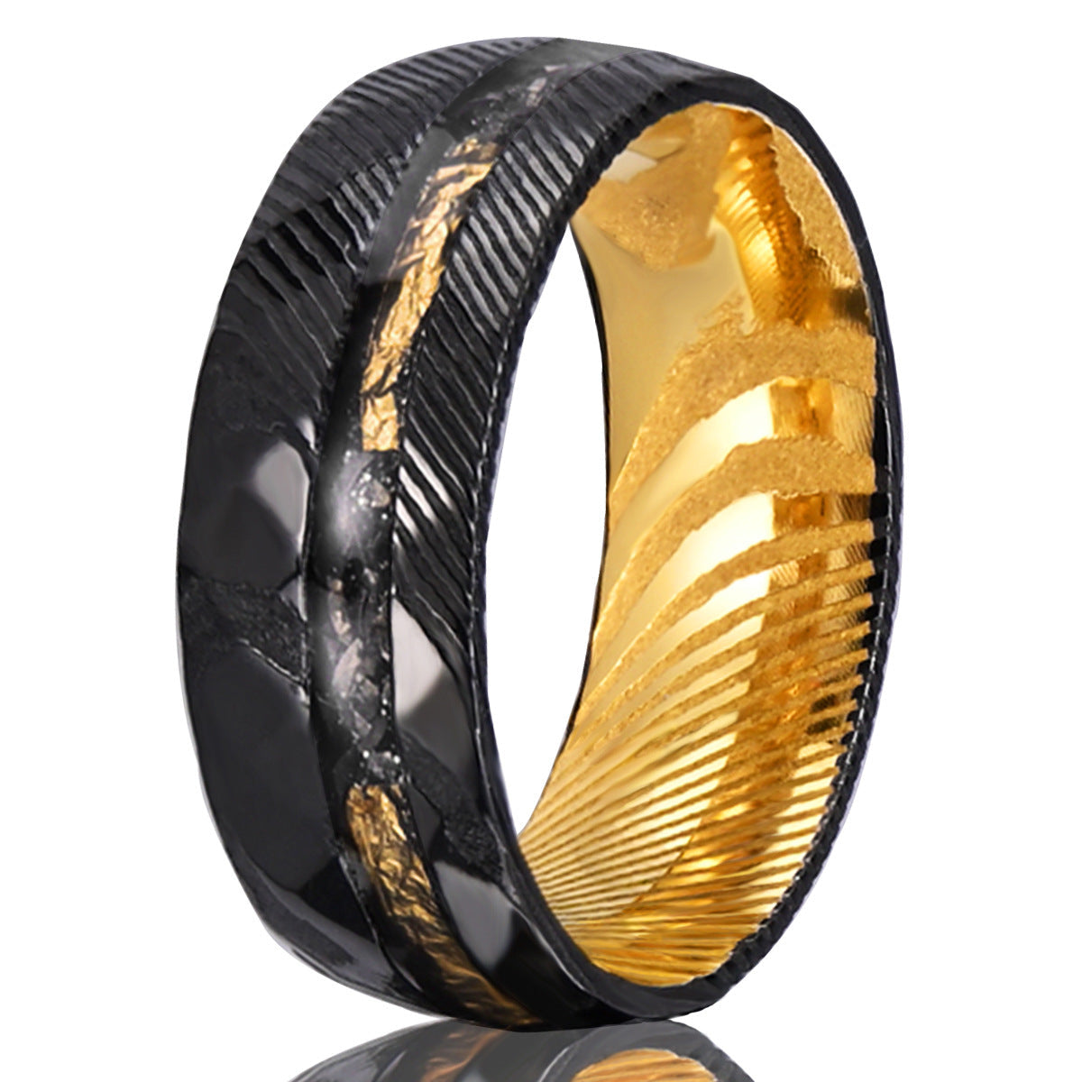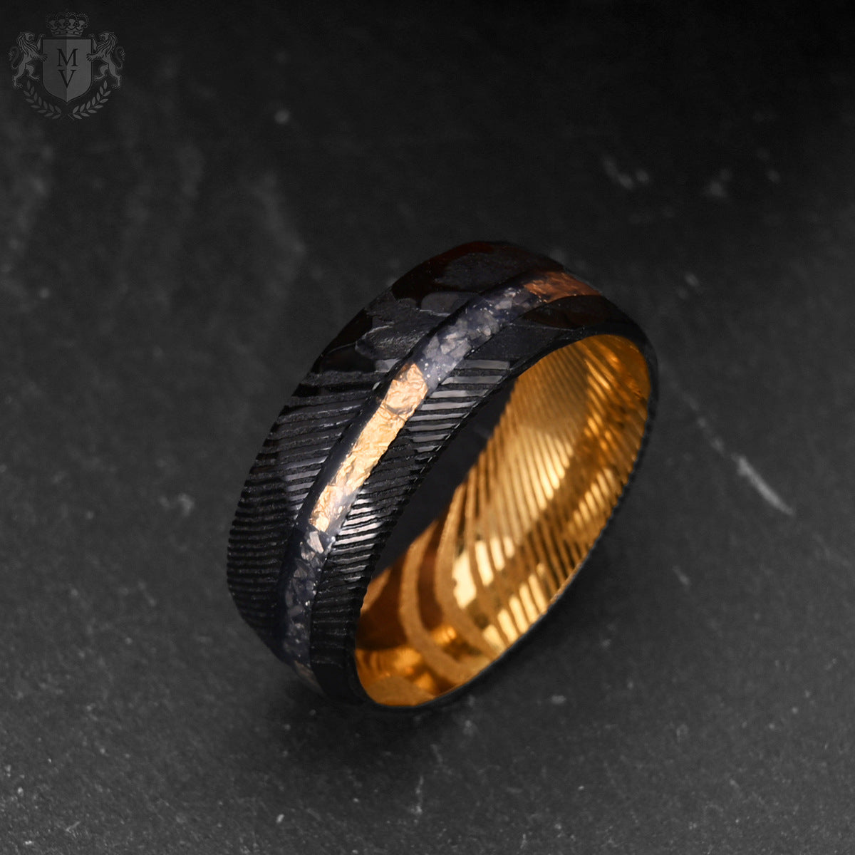 Zereth is forged for those who carry weight without speaking it. The Damascus steel surface, layered and dark, is broken by a raw, unfiltered line of 18K gold foil — a fracture that reveals fire within. Polished to contrast and lined with gold on the inside, it’s a piece that captures depth, complexity, and quiet power in one bold design.